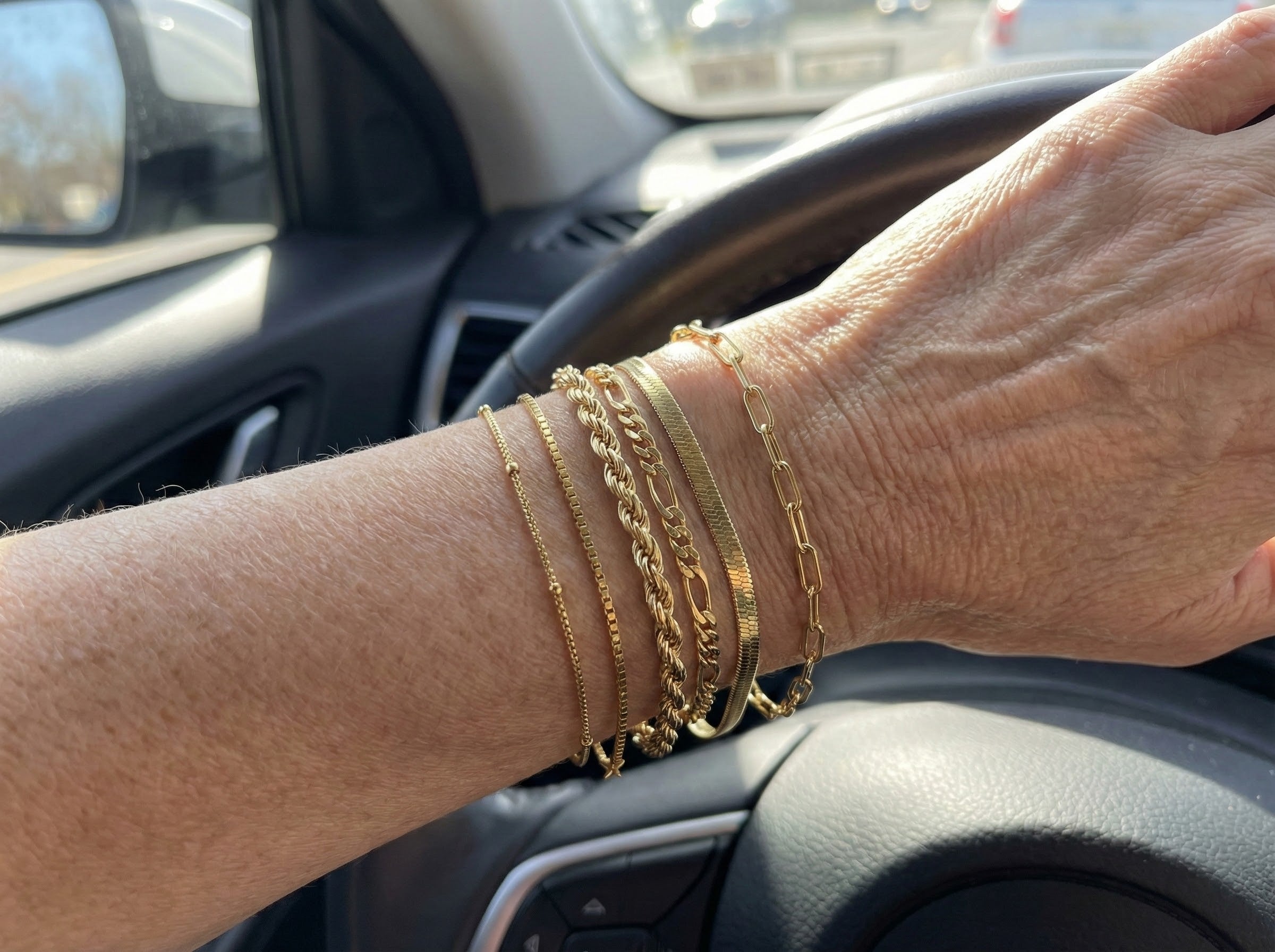 "I’ll be honest, when I saw 'store closing' and the low prices, I was worried these would look cheap or turn my wrist green. I was wrong! I’ve been wearing this stack for two weeks straight (even in the shower once by accident), and they still sparkle like solid gold. They have a nice weight to them. So glad I grabbed a set before they are gone."